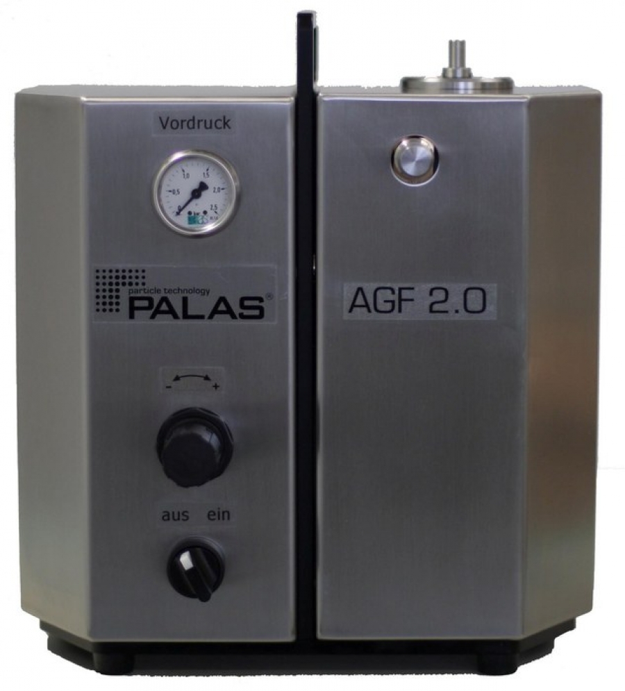 Das AGF 2.0 System besteht aus einer regelbaren Zweistoffdüse zur Einstellung des gewünschten Massenstromes, sowie aus einem Zyklon mit einer Trennschärfe von 2 µm. Somit werden so gut wie keine Partikel > 2 µm erzeugt.