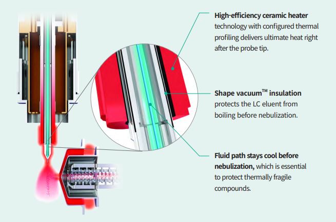 VIP (Vacuum Insulated Probe) Heated-ESI efficiently ionizes thermally fragile compounds such as nitrogen oxides, metabolites and certain pesticides without thermal degradation to ensure the exceptional sensitivity and reproducibility even for the trace level of samples.