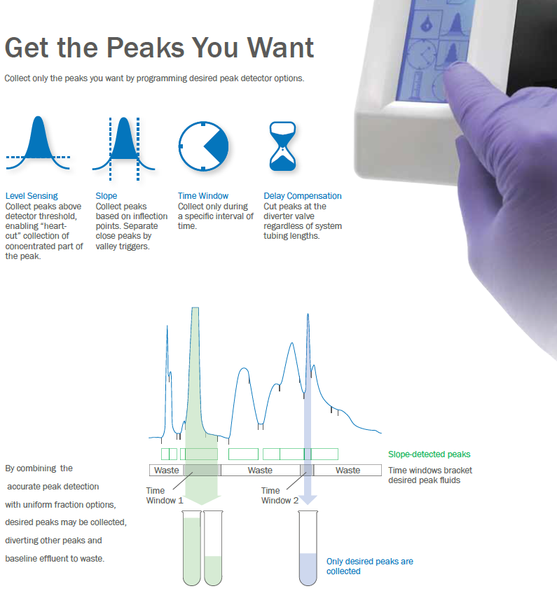Thanks to any combination of programmed time, threshold value, peak slope and any eventual delay compensation, you can collect exactly those fractions you need and transport all other effluents into the desired waste.